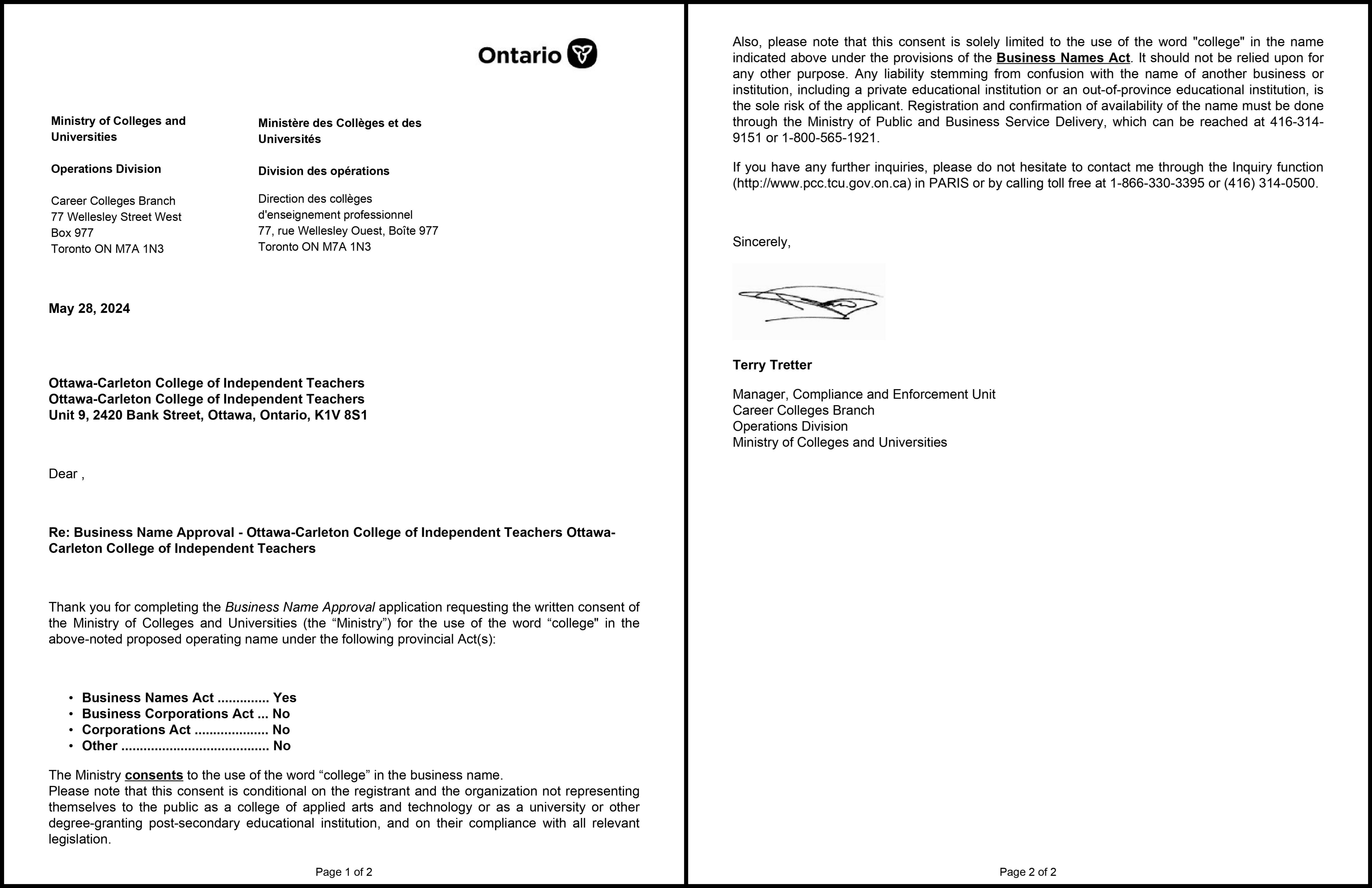 Ottawa-Carleton College of Independent Teachers was approved under the Ontario Business Name Act (BNA-28478199) on May 28th, 2024, by the Ontario Ministry of Colleges and Universities. Our approval is based on the premise that we do not engage in any educational or training activities, as agreed upon. Also, we do not represent ourselves as a public college of applied arts and technology, a university, or any other degree-granting post-secondary educational institution, and too comply with all relevant legislation.